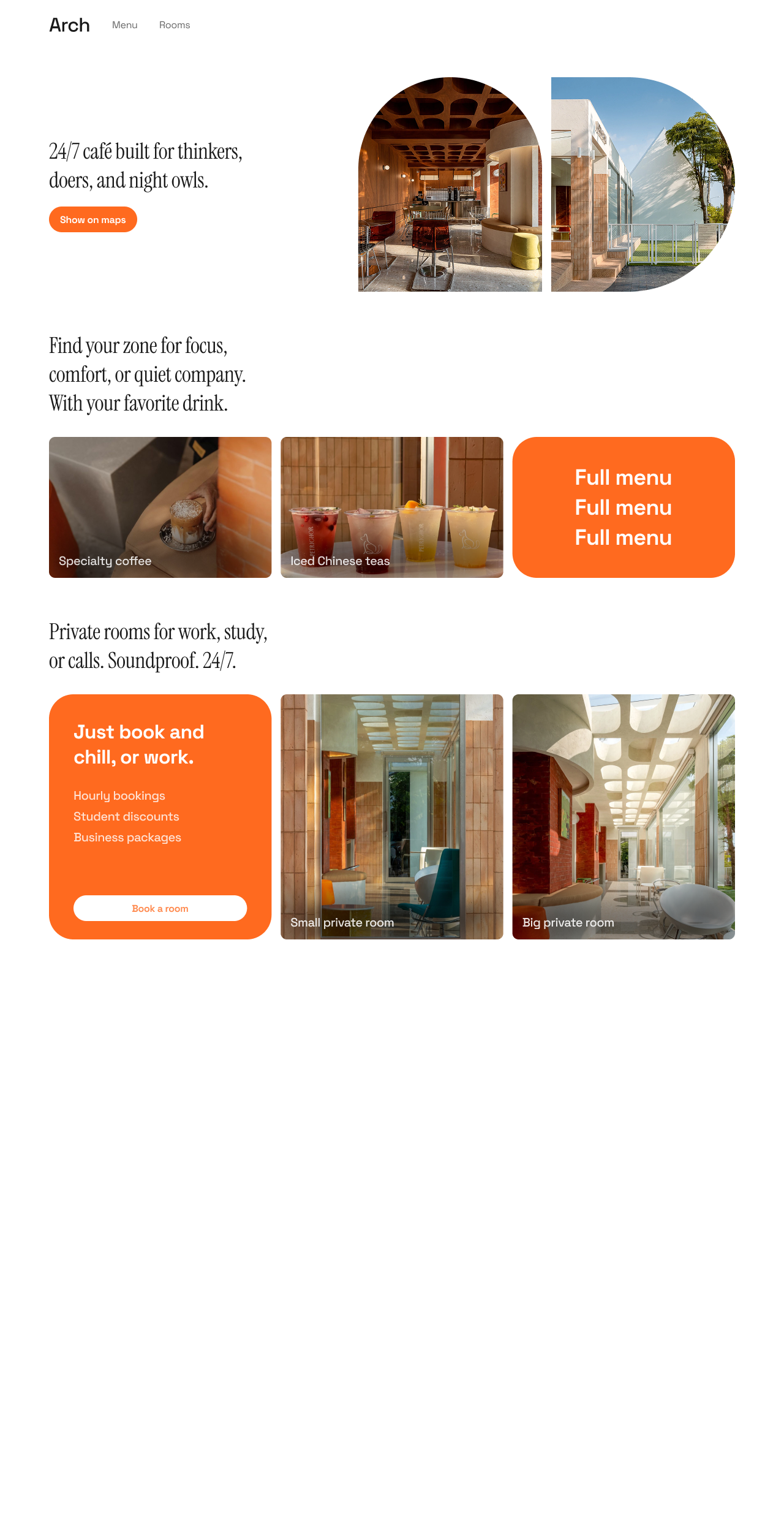 תכירו את Arch - קונספט לאתר של בית קפה־קואוורקינג שפועל 24/7. חלל פתוח לכולם כמו בבית קפה ״קלאסי״, אבל לאנשים שצריכים יותר, יש חדרים פרטיים בשביל שקט וריכוז. מקום אידיאלי לאנשים שיוצרים ועושים, מהבוקר ועד הלילה.